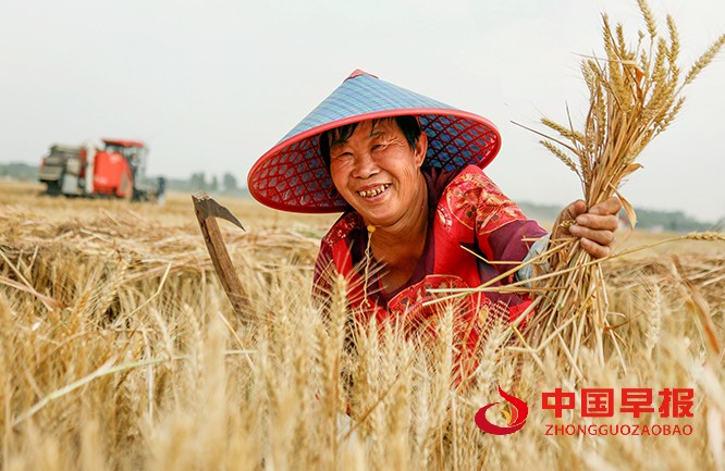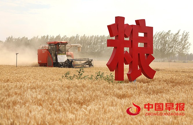 中国早报 河南讯(特约记者 李新义)6月5日,河南省开封市尉氏县张市镇沈家村的村民正利用大型收割机抢收小麦,确保颗粒归仓。