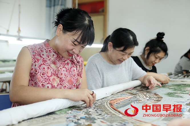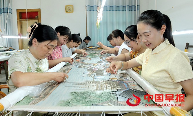 中国早报 河南讯(特约记者 李新义)8月27日,河南省尉氏县文萃厂汴绣工作室内暖意融融,10 余名绣娘围坐案前,指尖绣针在彩线与素布间灵活穿梭,随着针线起落,牡丹、祥云等图案渐次成形,细腻纹路中满是匠心。