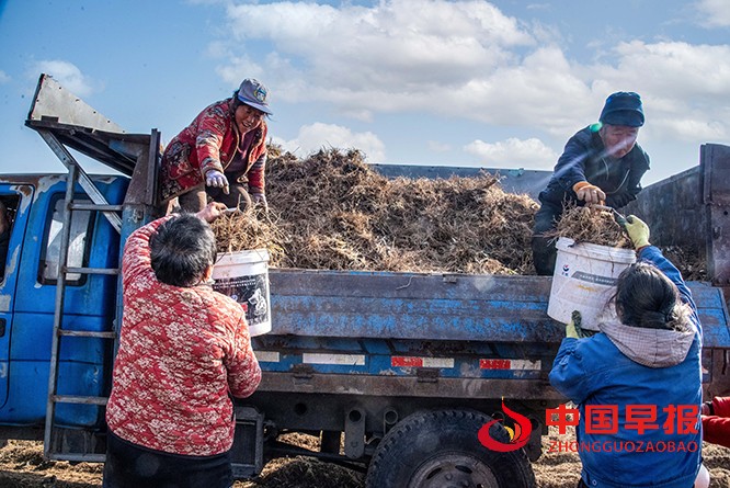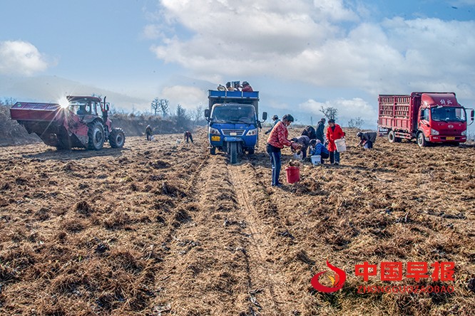 中国早报 山西讯(特约记者 田红萍)12月7日,襄汾县陶寺乡张再村的知母种植田里,一派热火朝天的丰收景象。广袤的田野上,村民们分工协作、干劲十足:有的操作药材挖掘机穿梭田间,高效采挖知母;有的手持铁锹,仔细将知母从泥土中翻出、拍净;还有的围在田垄旁,熟练地给知母去杂、分拣、装袋,每一道工序都有条不紊。