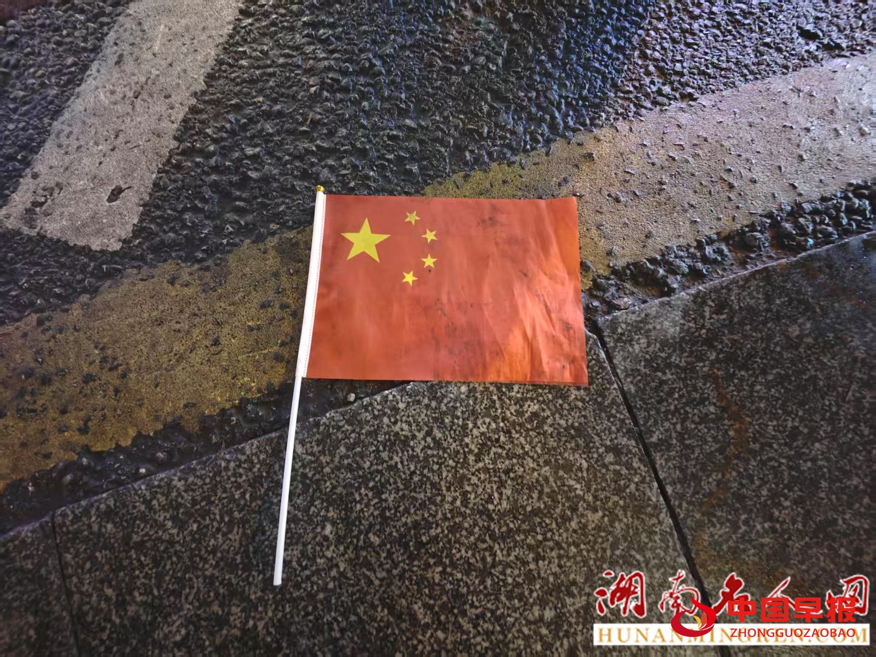 【雪言马语】2月14日傍晚,2025年情人节,长沙的天空,下了点毛毛雨。我和甜甜,在芙蓉区五一路上,吃完自助火锅,穿过地下通道,准备过蔡锷路口,等候红绿灯时,突然看见斑马线边,躺着一面五星红旗。