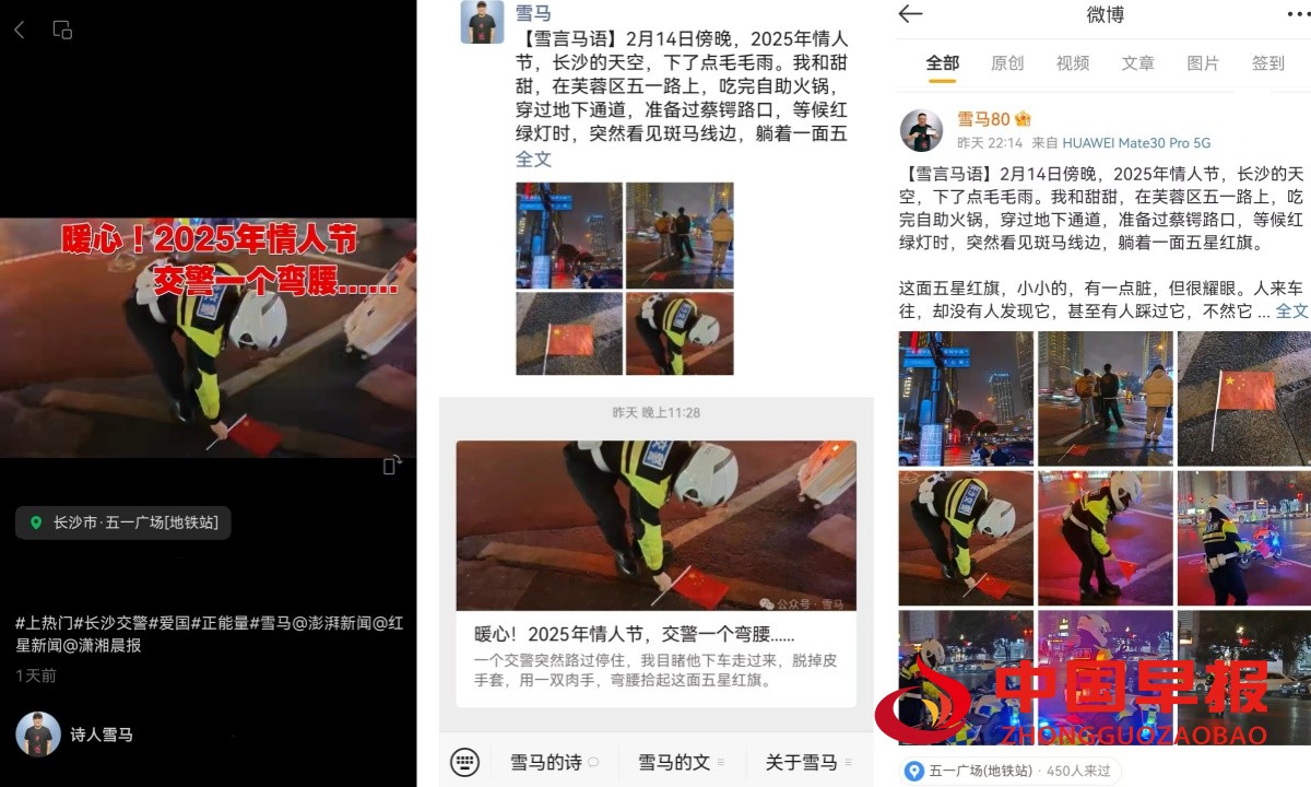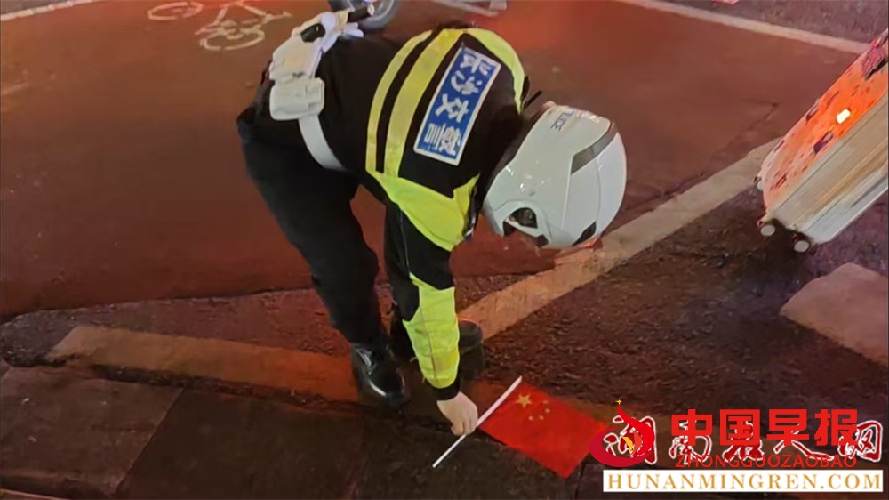 湖南名人网2月17日讯(通讯员 叶寻)2月14日情人节晚上,长沙市芙蓉区五一路上,诗人雪马在蔡锷路口,看见了一幕令人感慨万千的场景。在斑马线边,一面小小的略脏的五星红旗无人问津,许多行人匆匆路过,却忽视了它,也冷漠了它。然而,就在这时,一位交警弯腰拾起了这面国旗,他的爱国举动瞬间温暖了一颗诗人的心。