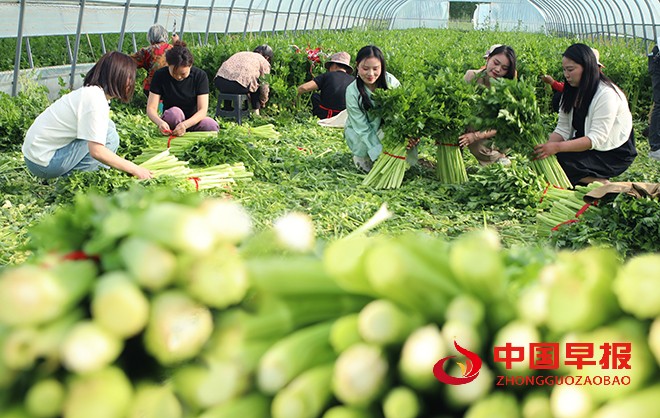 村民们穿梭于田垄间,麻利地挥动镰刀采收,刚割下的芹菜转眼被分拣、捆扎,整齐码放在自动传输带上。打包车间内将芹菜套上定制包装,贴上溯源二维码,随后装车发往京津冀地区的连锁商超。