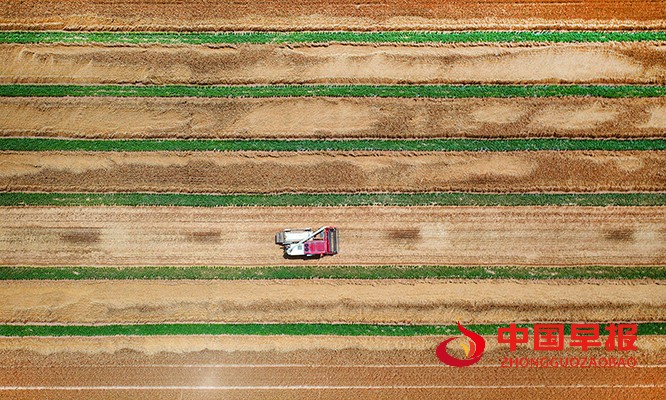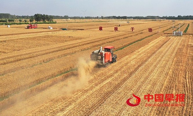 中国早报 河南讯(特约记者 李新义)6月5日,河南省开封市尉氏县张市镇沈家村的村民正利用大型收割机抢收小麦,确保颗粒归仓。