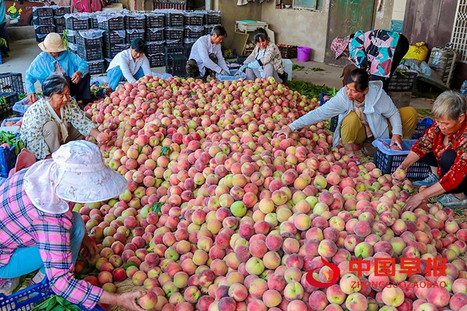 中国早报 河南讯(特约记者 李新义)麦收的金黄尚未褪去,河南省开封市尉氏县的万亩桃园已染上诱人的绯红。近日,尉氏县张市镇郭家村、门楼任乡沙沃村等地的万余亩桃树迎来丰收,圆润饱满的鲜桃压弯枝头,田间地头弥漫着清甜果香,果农们穿梭林间采收搬运,勾勒出一幅生机勃勃的乡村丰收图景。
