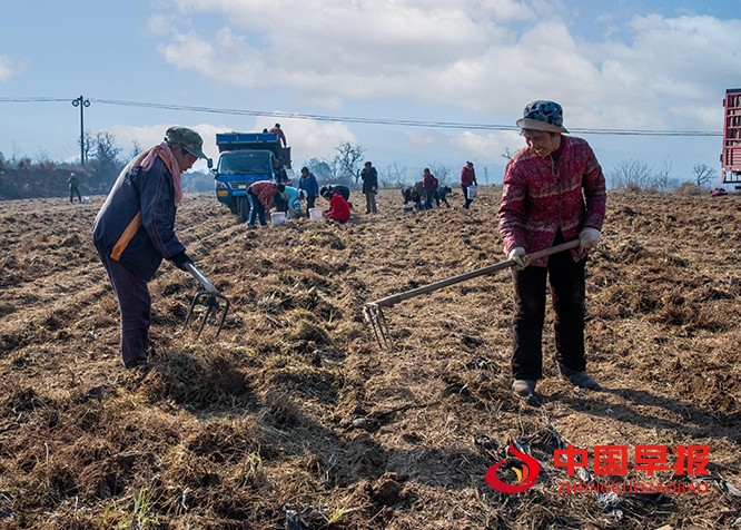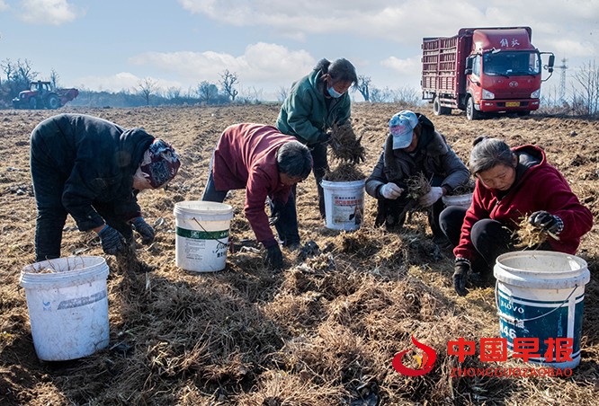 中国早报 山西讯(特约记者 田红萍)12月7日,襄汾县陶寺乡张再村的知母种植田里,一派热火朝天的丰收景象。广袤的田野上,村民们分工协作、干劲十足:有的操作药材挖掘机穿梭田间,高效采挖知母;有的手持铁锹,仔细将知母从泥土中翻出、拍净;还有的围在田垄旁,熟练地给知母去杂、分拣、装袋,每一道工序都有条不紊。